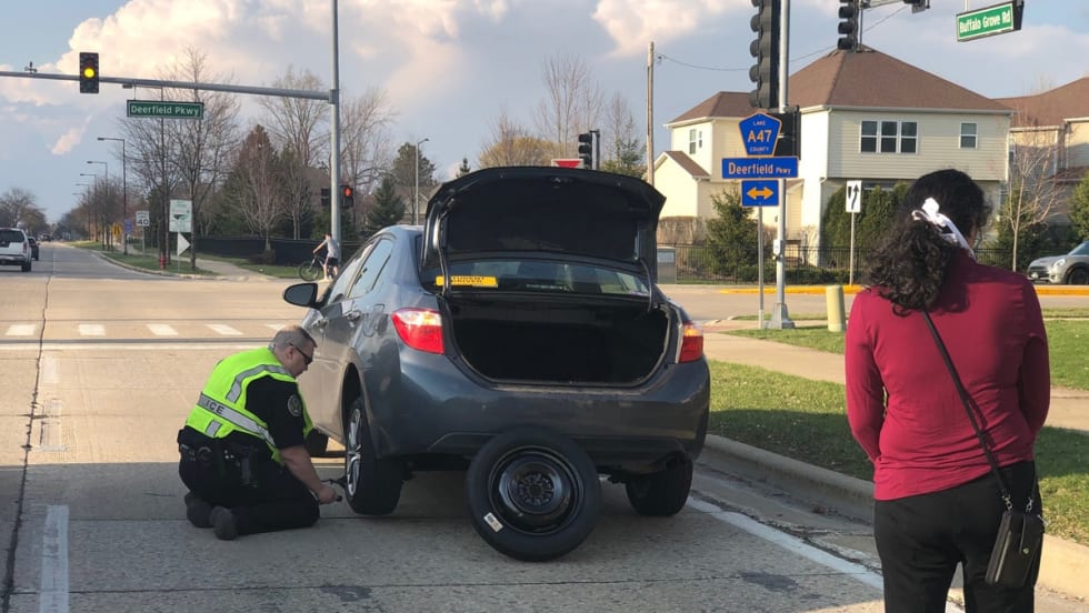 An officer with the Buffalo Grove (IL) Police Department was recently seen in an image posted to social media helping a stranded motorist change the tire on her vehicle.