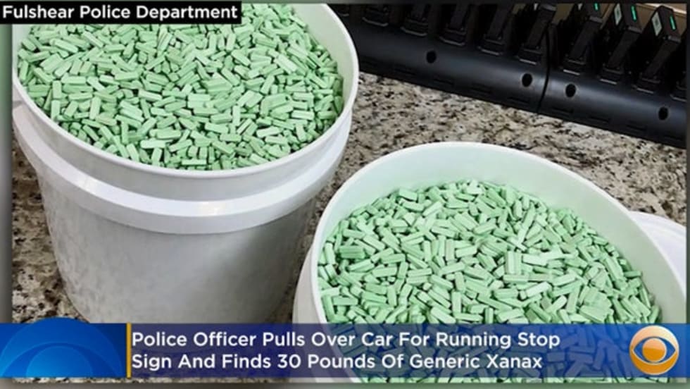An officer with the Fulshear City Police Department stopped the vehicle for a minor traffic violation. Upon investigation, the officer discovered a haul of 30 pounds of illegal alprazolam (the generic form of Xanax) with an estimated street value of up to $645,000.