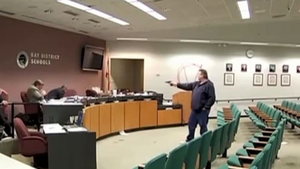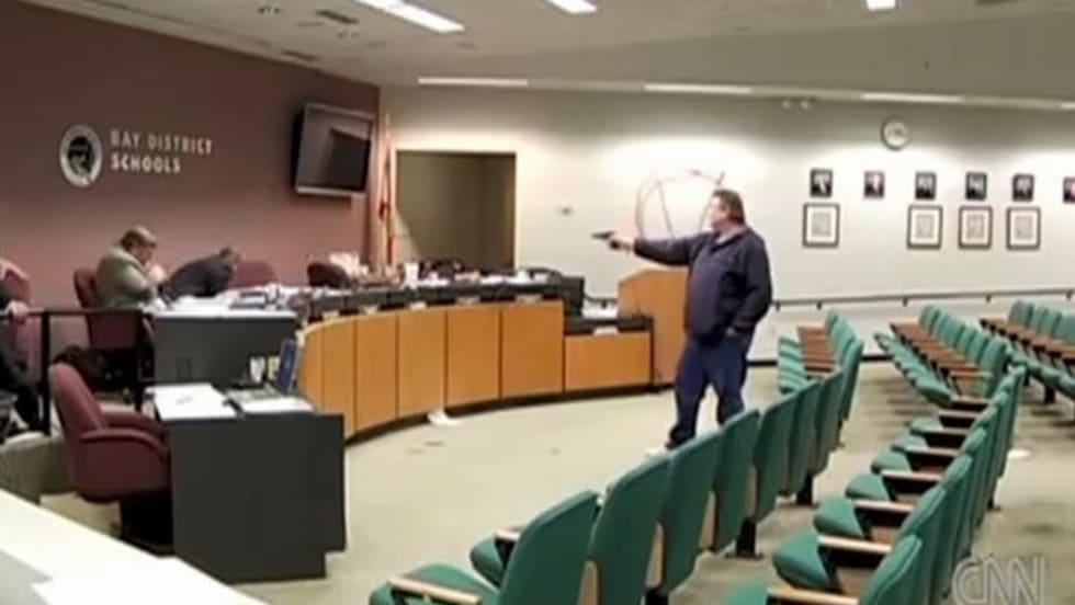 Prior to discharging his weapon, the shooter brandished a can of red spray paint and painted a V with a circle around it on a wall. He then brought out his weapon and began addressing the board meeting.
