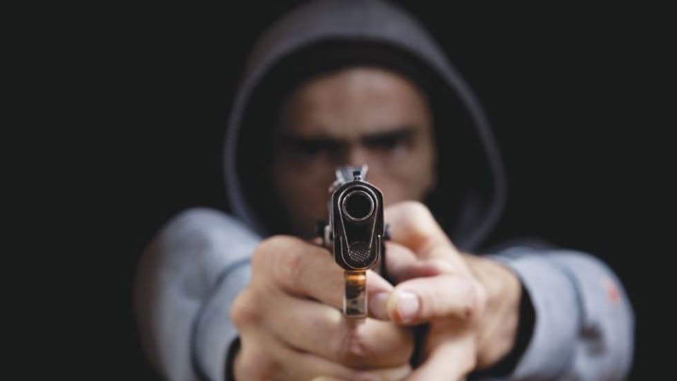 The two men continued a rapid fire exchange of rounds, the suspect standing atop the embankment and Reston struggling to move uphill toward him.