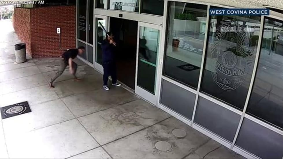 A bat-wielding man was taken into custody Monday morning after he threatened civilians and bystanders at the West Covina Police Department and was tackled by an officer, officials said.