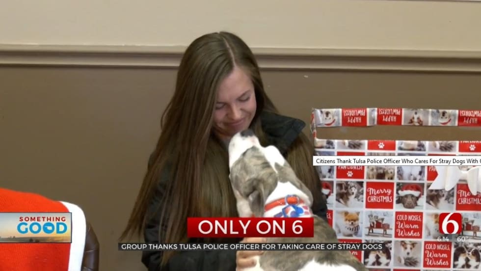 Tulsa police officer Lauren Opryszek fought back tears when she was surprised with all the goods, which she says will all be used to help stray dogs.