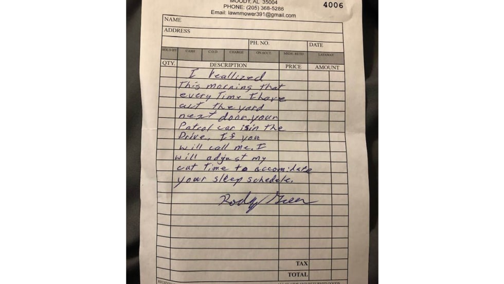 Officer Reece Smith with the Moody Police Department found a note from the lawn care service that regularly tends to his neighbor's yard stating that the worker just realized that he might be disrupting the officer's sleep.