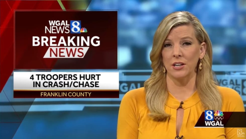 Four Pennsylvania state troopers were hurt Monday night when they were involved in a crash during a vehicle pursuit in Franklin County.