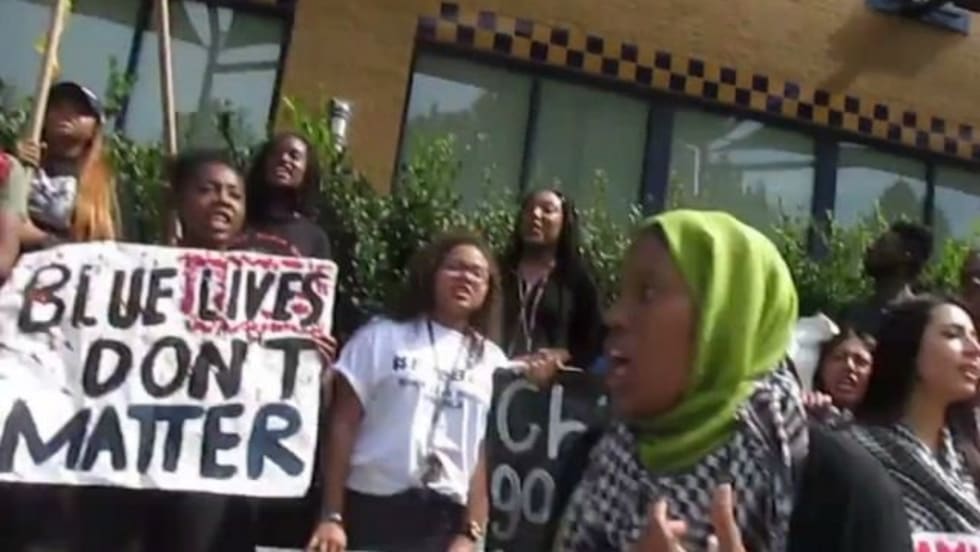 Black Lives Matter protesters at the University of California at Irvine were seen holding signs that read “Blue Lives Don’t Matter,” “Police Kill The Mentally Ill,” and “F**k the Police” Friday as part of their calls to ban the UC Irvine police department.