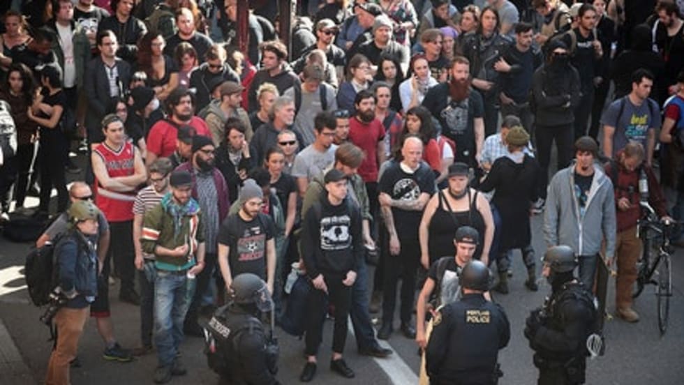 Portland, OR, police officers in riot gear prevented a full-scale clash between protest blocs by restricting access to Terry Schrunk Plaza, where Trump backers and free-speech advocates rallied for hours in a self-contained bubble within this liberal city.