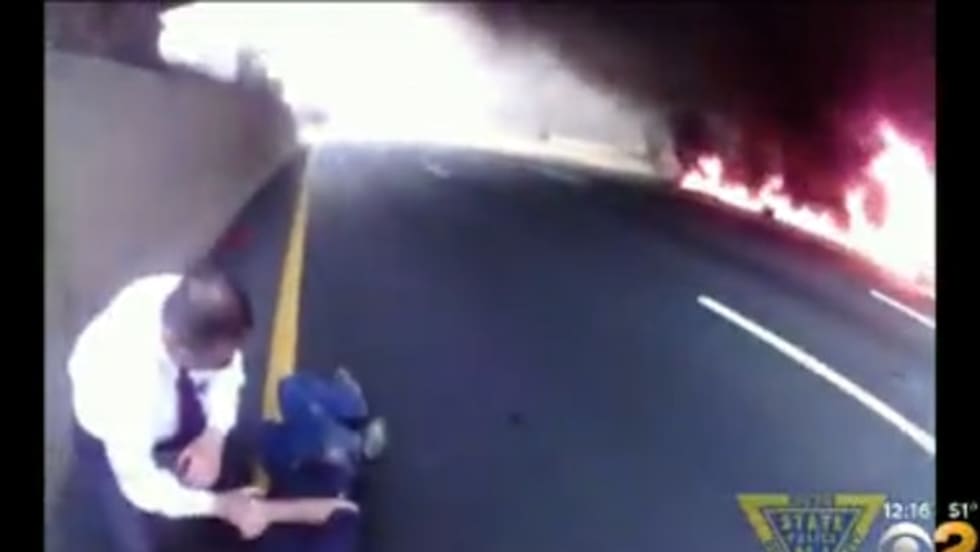 Two New Jersey State Troopers rescued a semi-conscious driver from a burning truck earlier this week, pulling him to safety just before the vehicle exploded in flames.