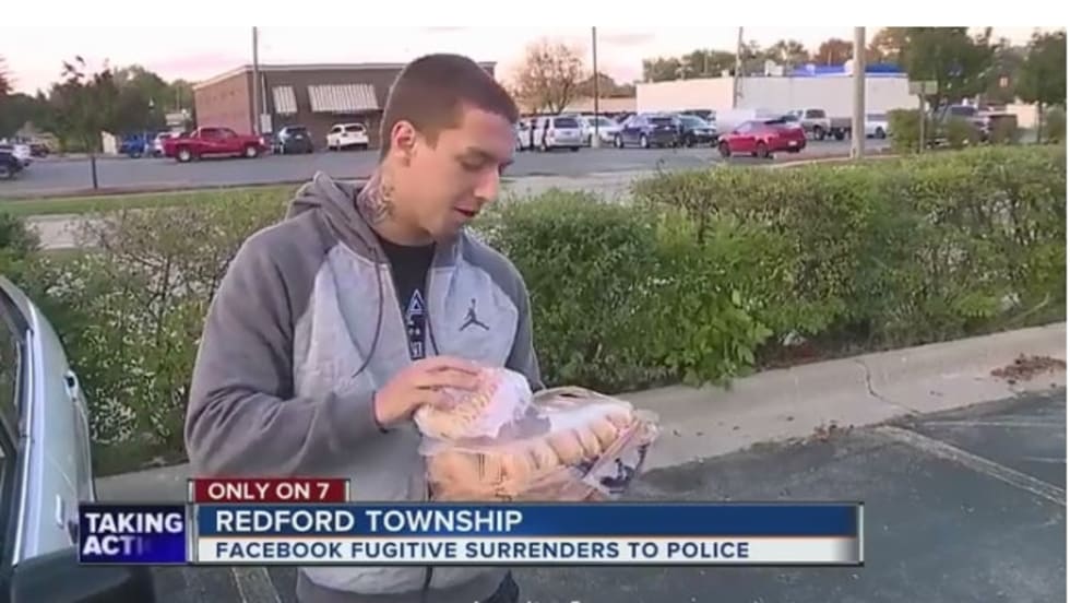 A fugitive who taunted Redford, MI, police on Facebook surrendered Monday night and even followed through on a promise to deliver a dozen donuts after losing a bet with officers.