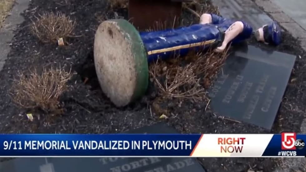 Vandals knocked over a statue of a police officer and left it in pieces at a 9/11 memorial in Plymouth, MA. A nearby figure of a firefighter was untouched.