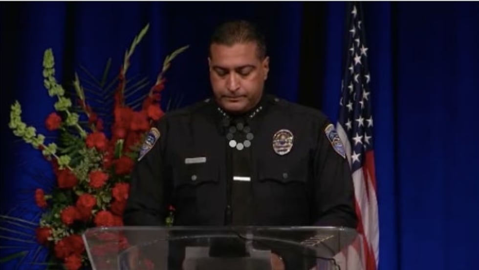 At Tuesday’s memorial for two slain Palm Springs, CA, police officers, the city’s police chief gave this powerful speech: