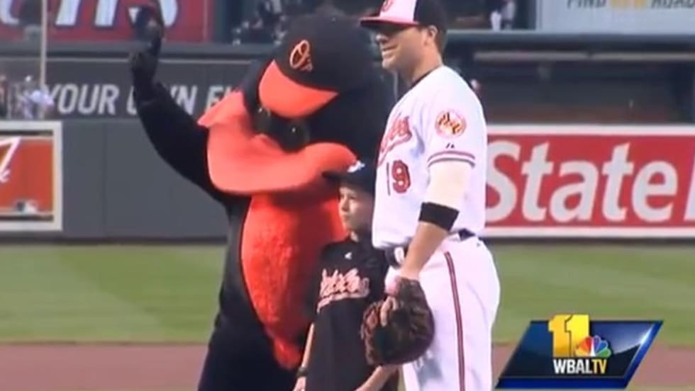 The son of slain Baltimore County police officer Jason Schneider threw out the first pitch at Thursday's Orioles game against the Chicago White Sox.