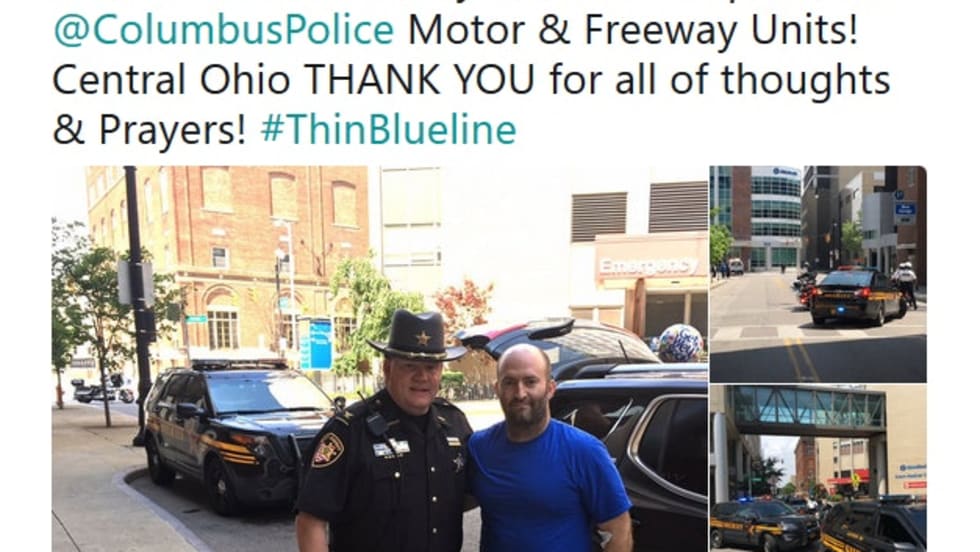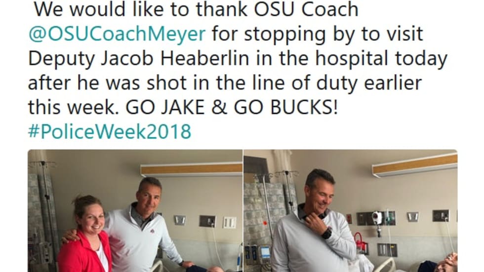 The head coach of the Ohio State football program, Urban Meyer, visited injured Franklin County (OH) Sheriff's Deputy Jacob Heaberlin in the hospital Wednesday. Deputy Heaberlin was shot in the line of duty Saturday.