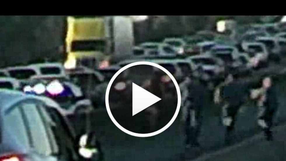 A man running across Interstate 5 in Marysville, Wash., shook off four TASER hits as he taunted officers and resisted arrest on Sunday. The encounter went viral after a family waiting in traffic on the shut-down interstate filmed it.