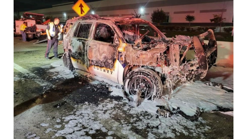 Deputy K. LeMelle was parked on the side of the road monitoring traffic around 2 a.m. when her patrol vehicle was struck from the rear by a commercial work vehicle after the driver veered onto the shoulder.