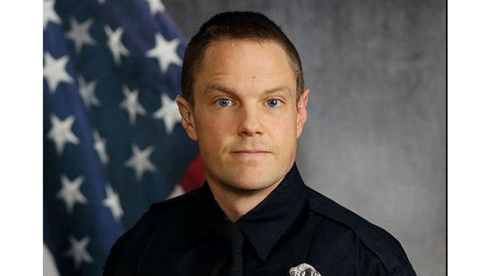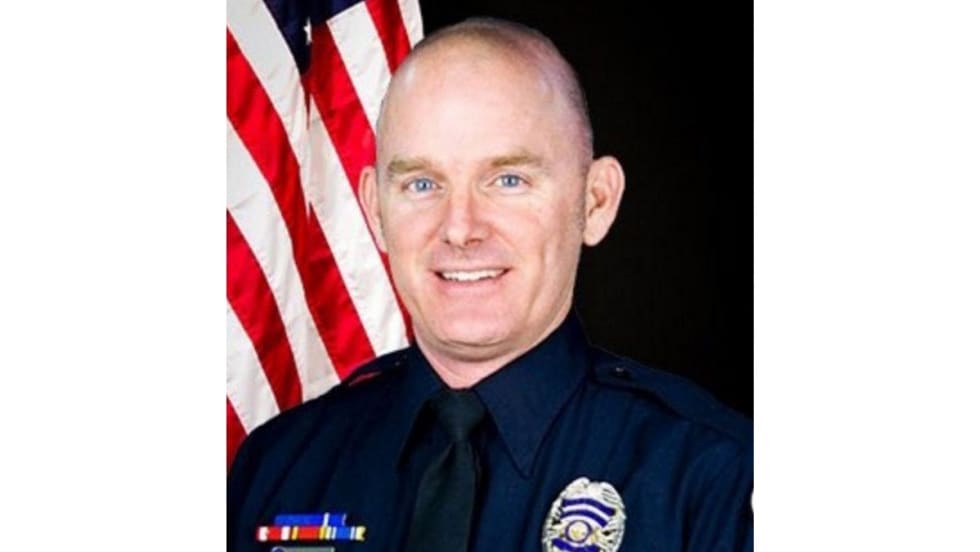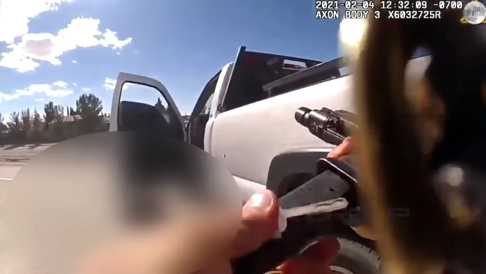 Las Cruces police officer Adrian De La Garza is seen shot by suspect Omar Felix Cueva and falling to the ground, but he quickly gets up and continues firing at Cueva until he reaches the suspect's car. Cueva was killed during the shootout with officers.