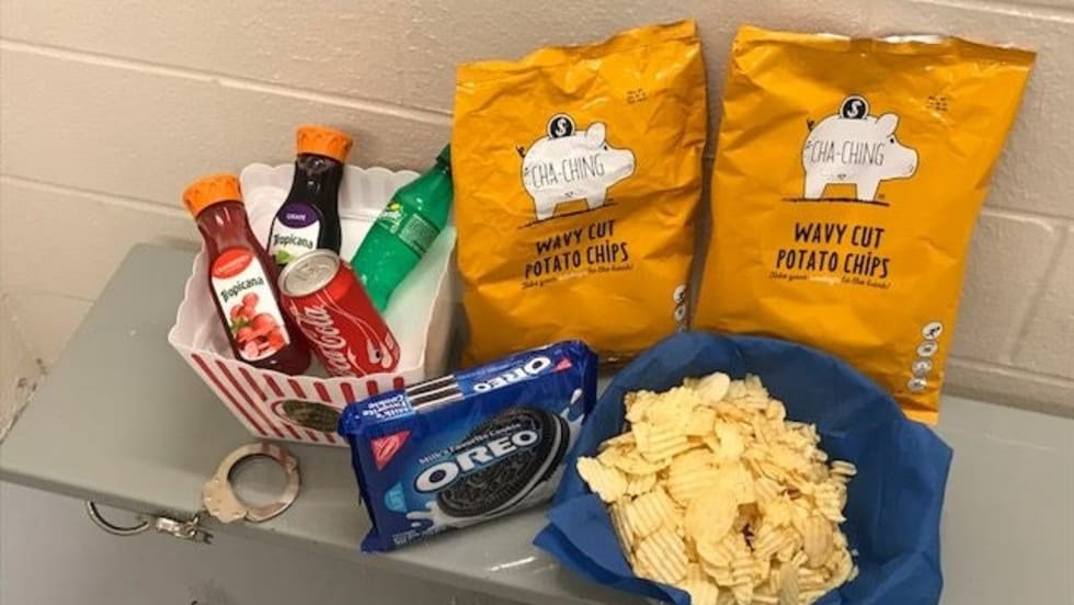 Photos of a holding cell stocked with Oreos, Coca-Cola and Cha-Ching wavy potato chips in a bowl accompanied the post. A pair of handcuffs was casually placed next to the Oreos.