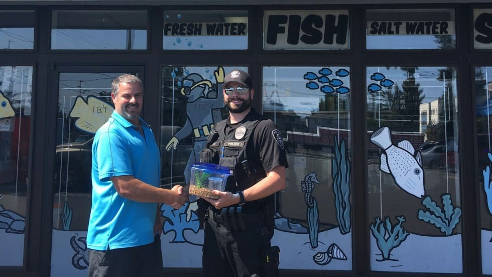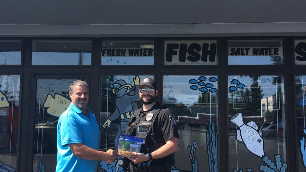 Police officers with the Gresham (OR) Police Department have a new officemate—a fished named Rocky.