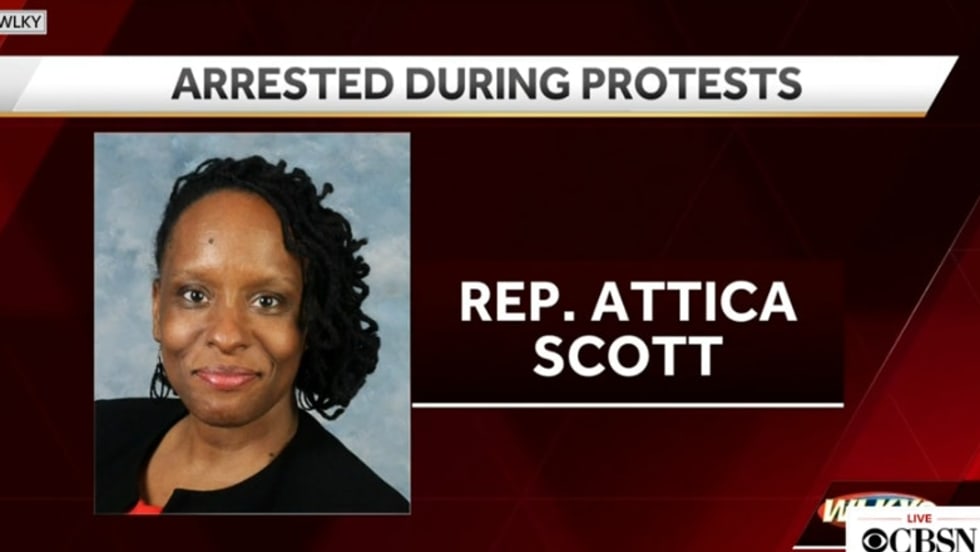 State Representative Attica Scott was part of a large group that was told to disperse but failed to do so. The arrest report alleges that she "caused damage at multiple locations, including setting fire to the Louisville Public Library."