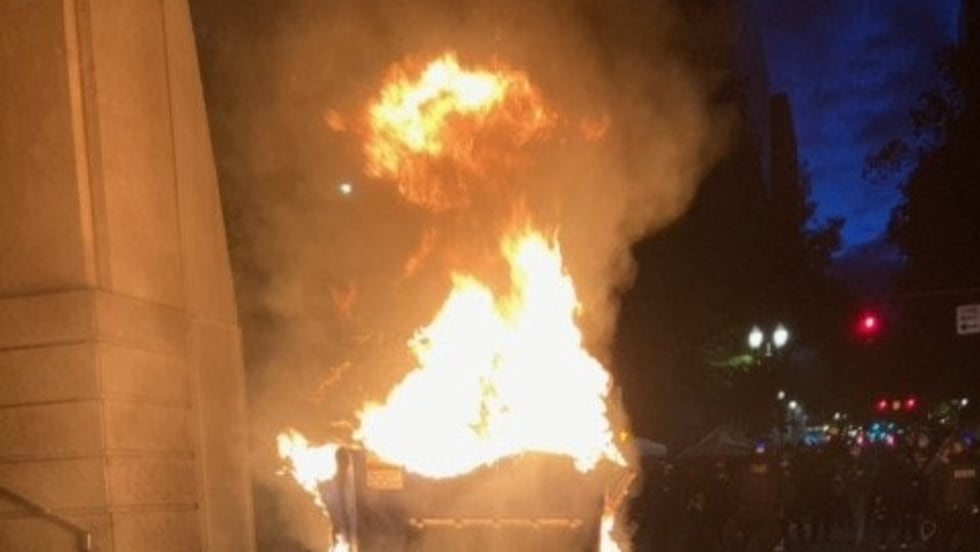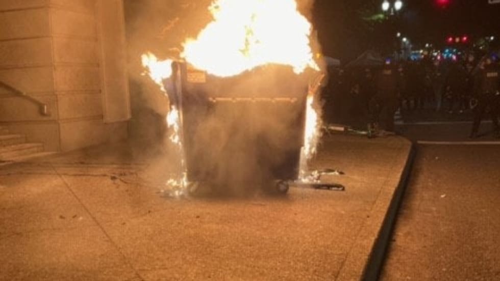 A crowd of roughly 200 people – many dressed in black – gathered outside the city's Multnomah County Justice Center. Some lit a dumpster on fire and tagged the justice center with graffiti, while others yelled, "Burn the building down," police said.