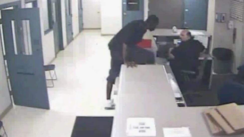 Anthony Thomas, 29, of Cleveland can be seen in footage taken from the station's surveillance cameras leaping over the counter and jumping on the back of Officer William Witt, who is seated working at a computer.