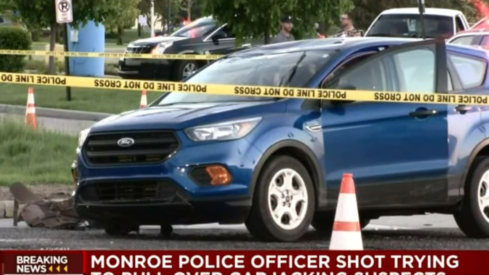 An officer with the Monroe (MI) Police Department was shot twice at a traffic stop on Sunday evening as she attempted to conduct a traffic stop of a vehicle suspected to have been carjacked earlier in the day.