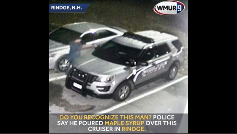 A Rindge (NH) Police Department squad car was vandalized this week by a man who poured maple syrup all over the vehicle.