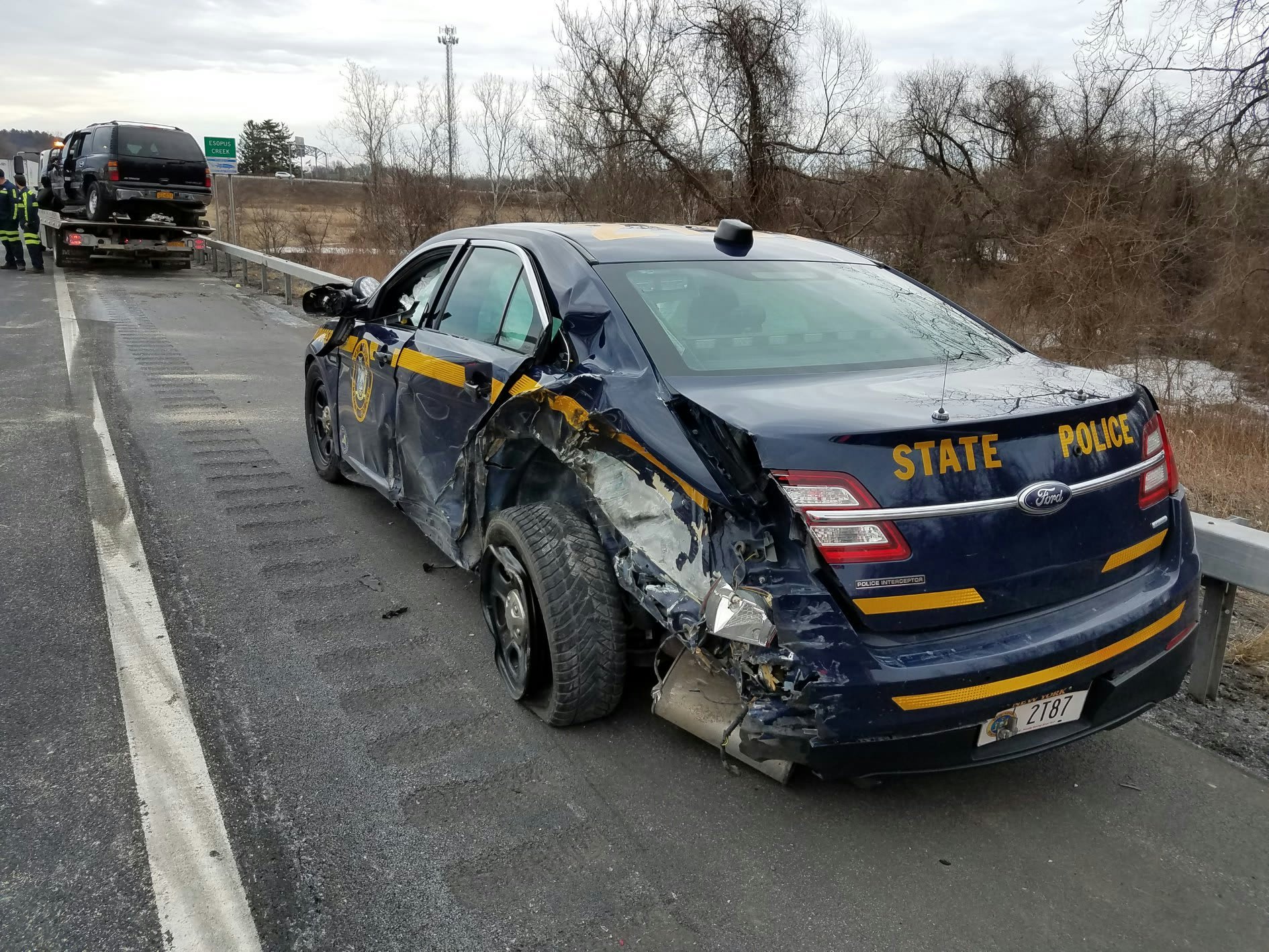 A trooper with the New York State Police suffered minor injuries when a tractor trailer truck struck his vehicle as he was assisting a disabled vehicle.