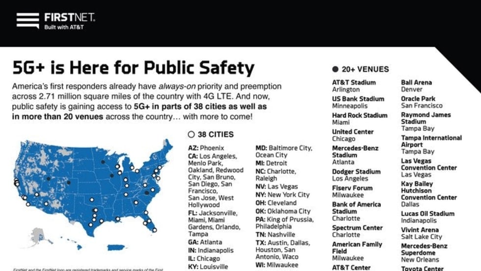 The company says 5G connectivity on FirstNet will be "ideal for IoT and video intelligence solutions." Examples include being able to deploy cameras to the front gate of a stadium and screen attendees’ temperature to potentially help prevent the spread of COVID-19 and using 5G in an ambulance to transmit patient data back to the emergency room.
