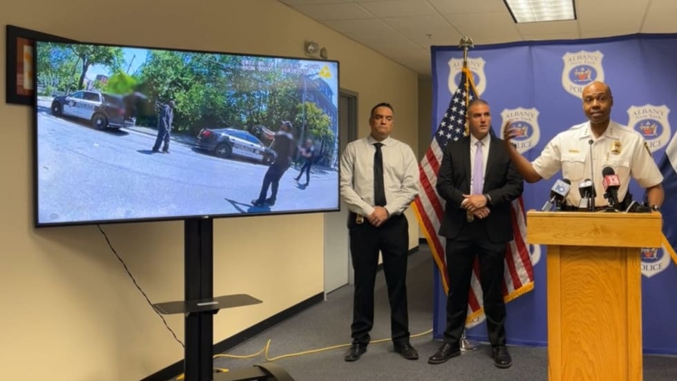 A 54-year-old man armed with a knife stabbed an Albany, NY, police officer in the bicep Monday and then was shot by another officer. After being shot in the torso, the suspect continued trying to stab the officer again.