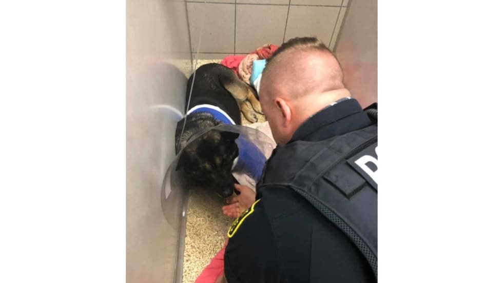 Jerry Lee was rushed to the Blue Pearl Animal Hospital in Sandy Springs shortly after the shooting, the GBI previously said. He was released from the hospital Tuesday afternoon, wearing a blue cast from paw to shoulder as he pranced to meet his handler.
