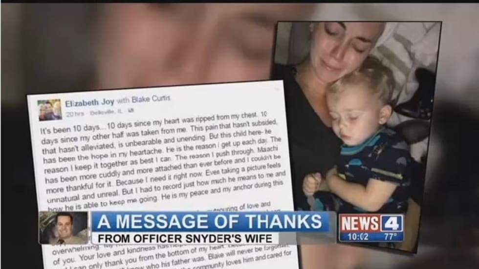 Snyder posted a picture of herself and her two-year-old son Malachi with a message opening up about the days after her husband was shot and killed after responding to a disturbance call.