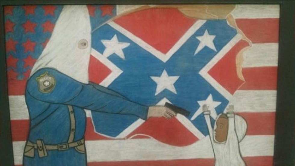 Yesterday afternoon the Colorado Fraternal Order of Police began to receive a flood of calls into its state office from outraged officers and from equally upset civilians concerning a painting that the city had allowed to be prominently displayed to the public in the atrium on the main floor of Denver’s Municipal Webb Building.