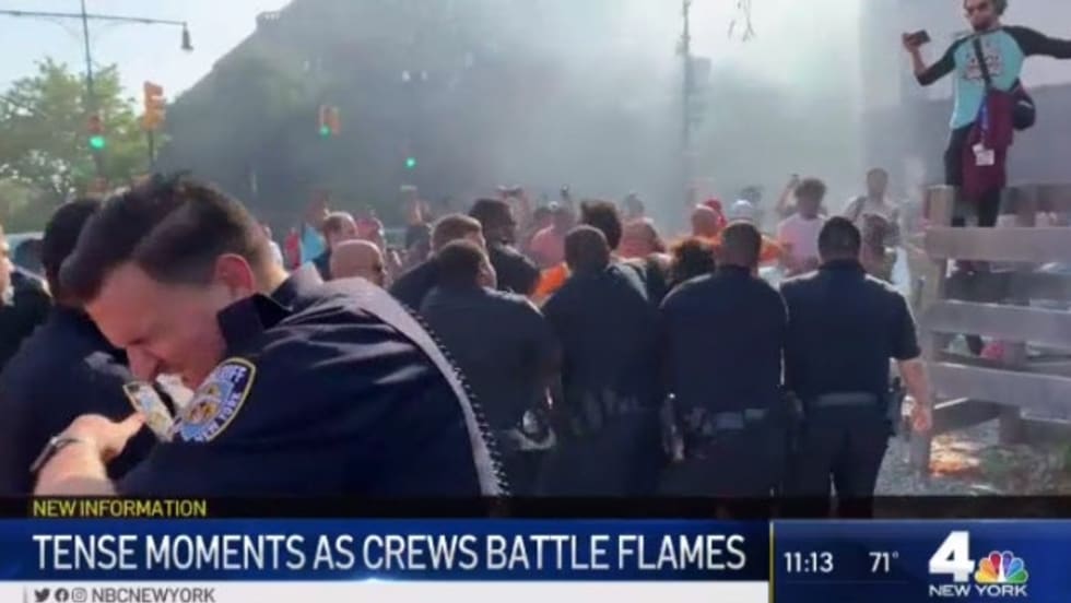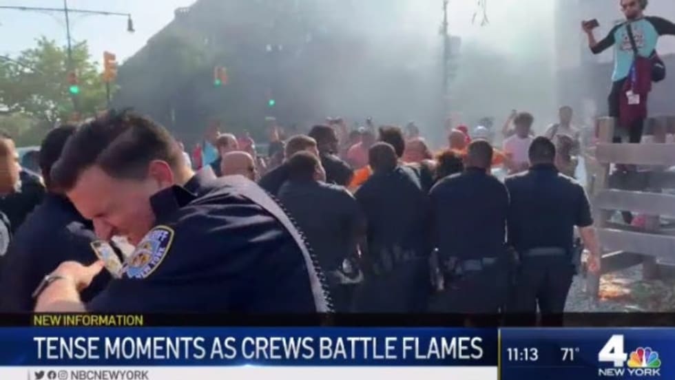 The fight between officers and residents started as crowds refused to make way as the officers demanded they move. Police say a 39-year-old woman ripped an officer’s body camera off and threw it to the ground, while another person threw a carton of milk at the officers before running off.