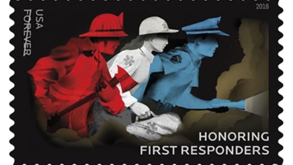 The new Forever stamp will be available starting later this year. It features a firefighter, an EMS worker, and a law enforcement officer all racing into action.
