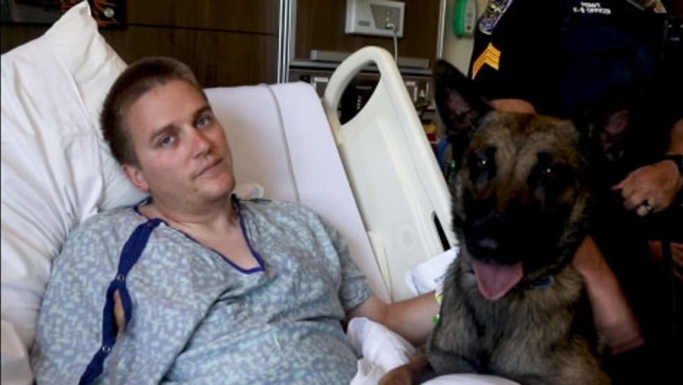 An officer with the Auburn (AL) Police Department who was critically wounded in a triple-shooting Sunday night received a visit at his hospital bed on Wednesday from his K-9 partner Leon.