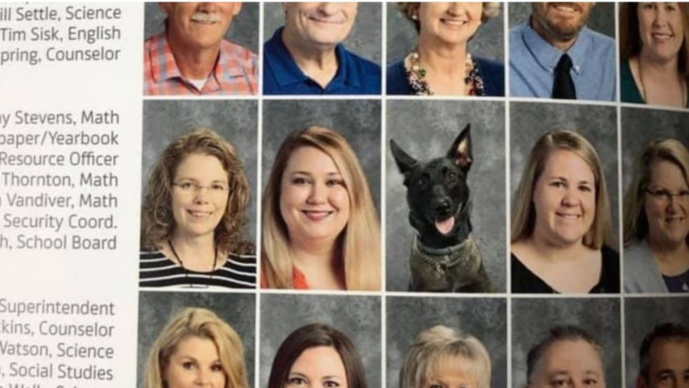 A Bryant, AR, police dog's photo was featured among faculty members in the Bryant High School yearbook this year.