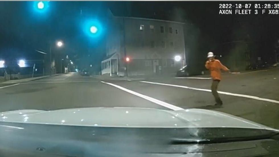 In a video released by the Connecticut Inspector General, Officer Chad Curry is attempting to apprehend a man in an orange shirt early Friday morning. Police said he was running away from the scene of a car crash.