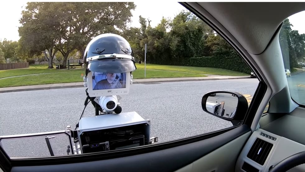 Once the officer’s vehicle is parked behind the motorist’s car, GoBetween rolls up to the driver’s side window of the motorist, where it becomes the officer’s eyes, ears and mouth. A spike strip automatically placed in front of the car’s rear wheels keeps the motorist from driving away until the traffic stop is completed.