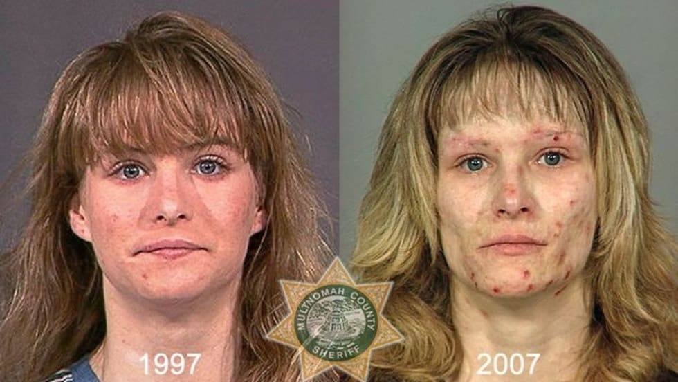 As with "Faces of Meth," the documentary uses booking photos to show faces that were once normal, yet become ravaged, toothless wrecks to illustrate the physical damage caused by abusing meth, cocaine, and heroin.