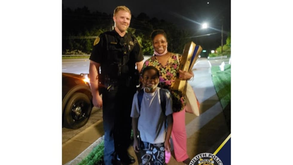 An officer with the Duluth (GA) Police Department who had come upon a woman and child walking down a rural road early Tuesday morning made a call to a car service so that they could safely get to a relative's house after their car broke down.