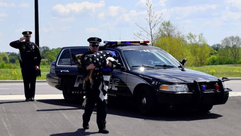 Officer Eric Nicholson gathered Klink in his arms—the dog wrapped in a Thin Blue Line flag—and made the animal's final walk as officers stood in salute and citizens stood in support.