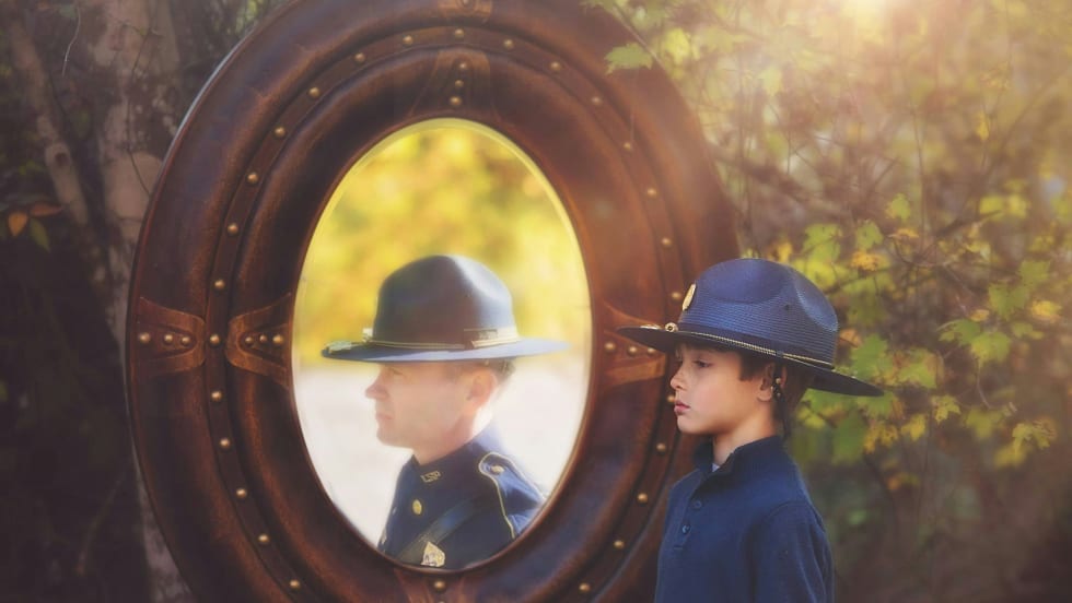 A few months after Trooper Vincent's death, Katherine asked photographer April Reeves to take pictures of Ethan and incorporate images of her late husband into some of the photographs.
