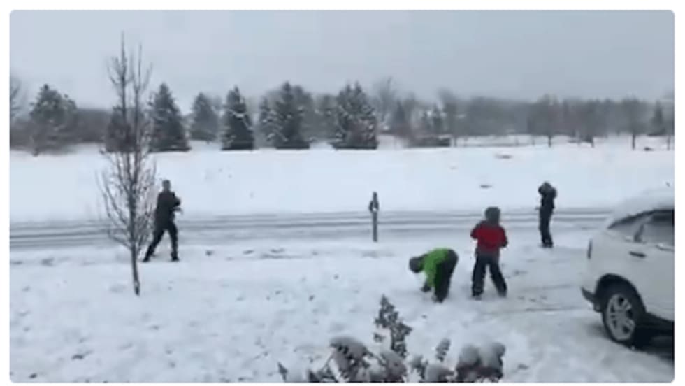 An officer with the New Palestine (IN) Police Department was captured on cell phone video taking a few moments of his day to join some boys involved in a vigorous snowball fight.