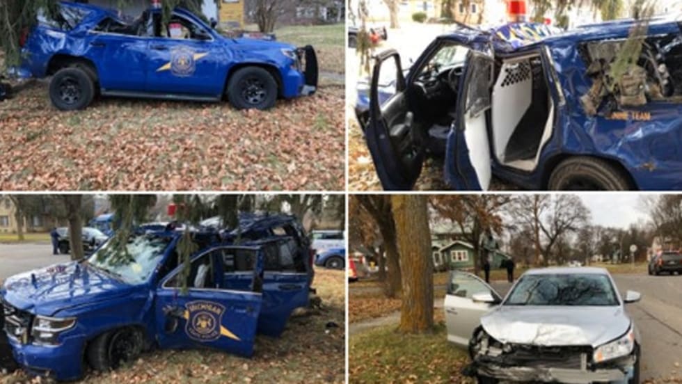 A trooper with the Michigan State Police was injured and trapped inside his vehicle in a rollover crash as he was responding to a stabbing call on Tuesday.