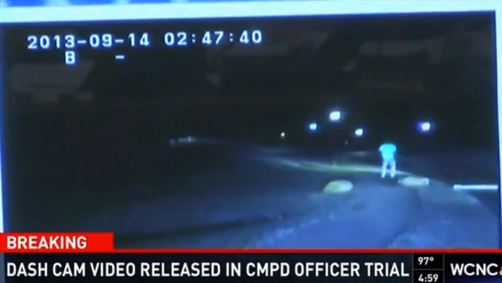 Officer Adam Neal, whose car captured the dash cam video, described what can't be seen on the video, saying that after the initial volley of shots, Jonathan Ferrell's upper body fell on Officer Kerrick's legs, the two men then fell into a ditch and continued to be engaged.