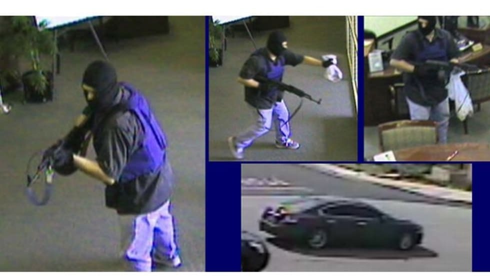 A bank robber wearing body armor and wielding an AK-47 fired six to eight shots at a Chino, Calif., police officer who spotted him leaving the bank.