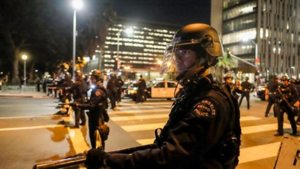 A Los Angeles police officer’s pistol was stolen Thursday night during a fight with a woman, who attacked him with his handcuffs as protesters flooded downtown to decry the election of Donald Trump.