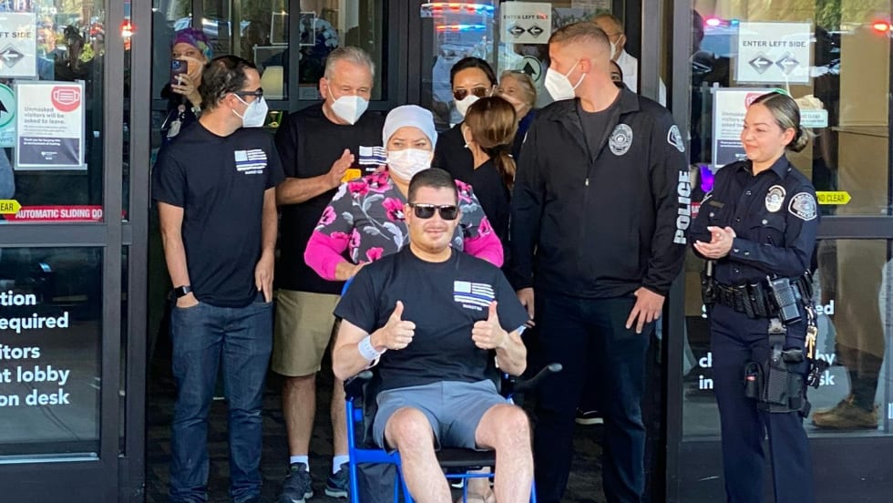 Officer Kevin Manley was greeted by fellow officers, friends, and family after being discharged following two surgeries.