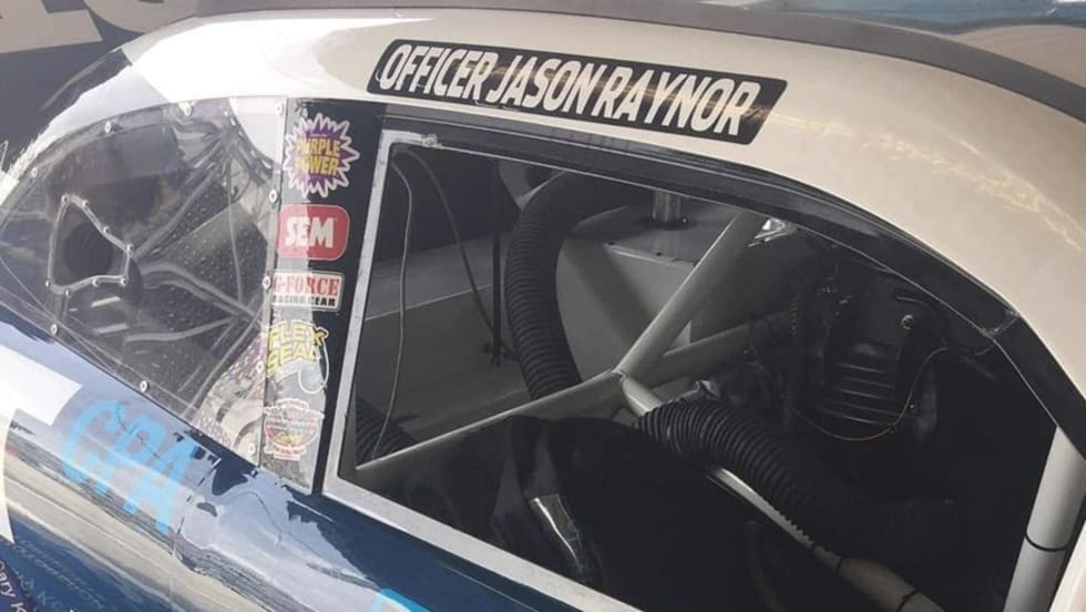 In addition all cars for JD Motorsports carried Officer Jason Raynor’s name above the passenger windows, and his call sign, 3Charlie77, on their roofs during the race weekend.