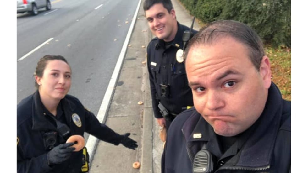 Officers with the Brookhaven (GA) Police Department were called when a citizen reported that a Krispy Kreme donut delivery truck had mistakenly ejected a number of glazed donuts on the side of the road.